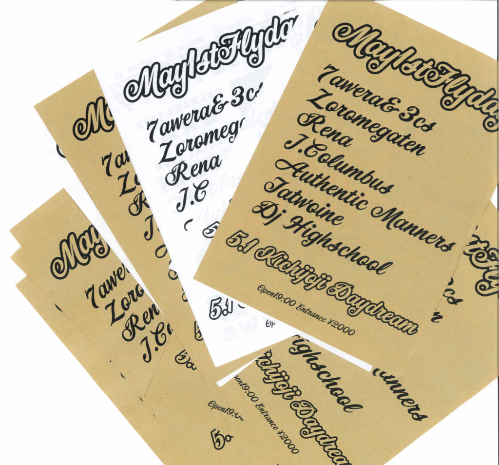 この間TRIBECAで7AWERA、YIN、3CSと話していて、みんなで西東京でも遊びたいなって思った。その翌週にYINと3CSが呼んでくれたPOWERS2にYOたちが来てくれて話してて、西東京でみんなで遊びたいなと思った。気がついたらPARTYを始めてたみたいな感じで、ここをめがけても、どこかの通過点でも金曜日の夜に遊びましょう。タイトルは考えに考えた結果、日付になった。FLYDAYって言い方はたくさんの人がしてるけど、自分はCENJUのQROIXとの作品のイメージが強い。
